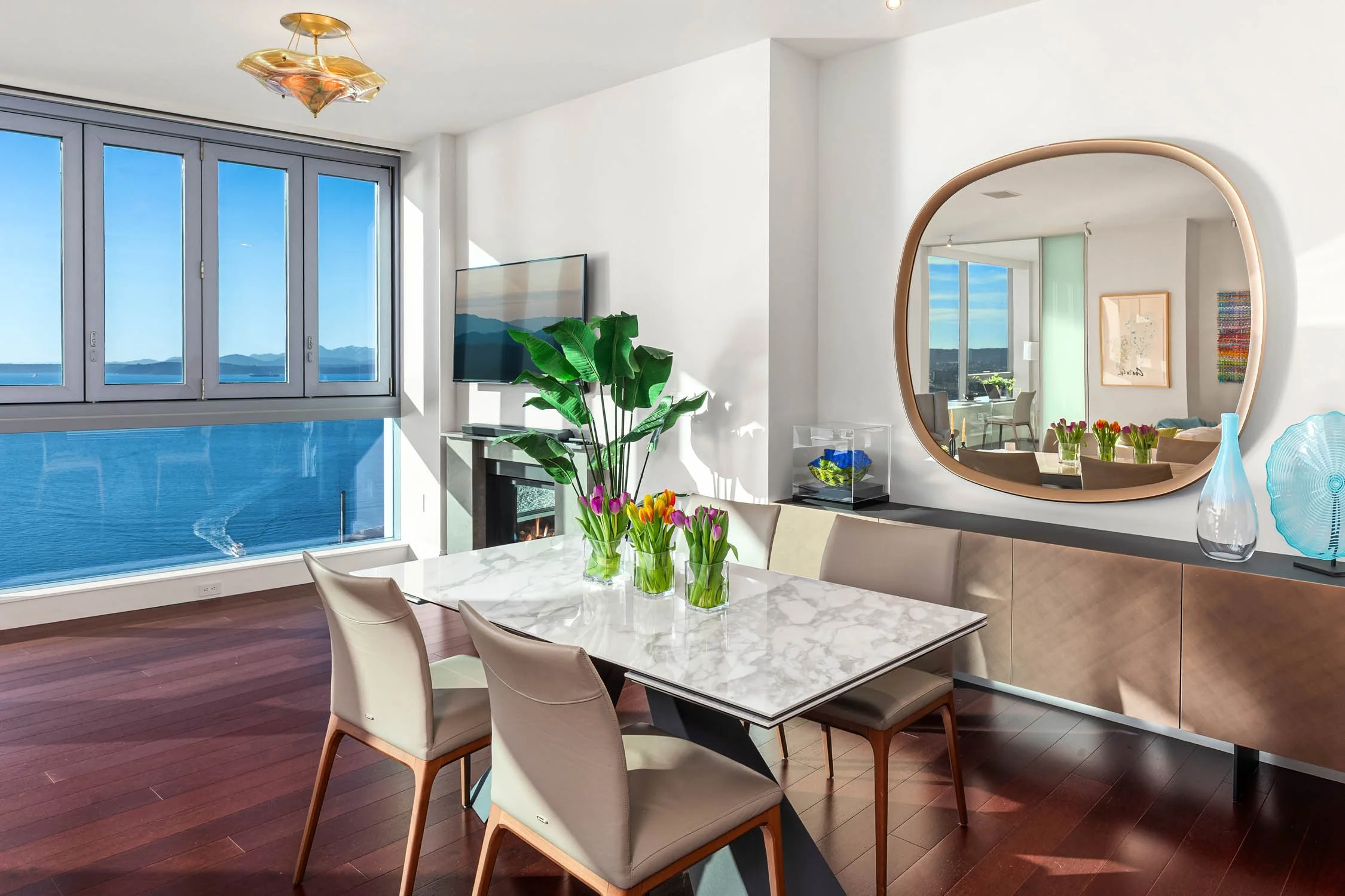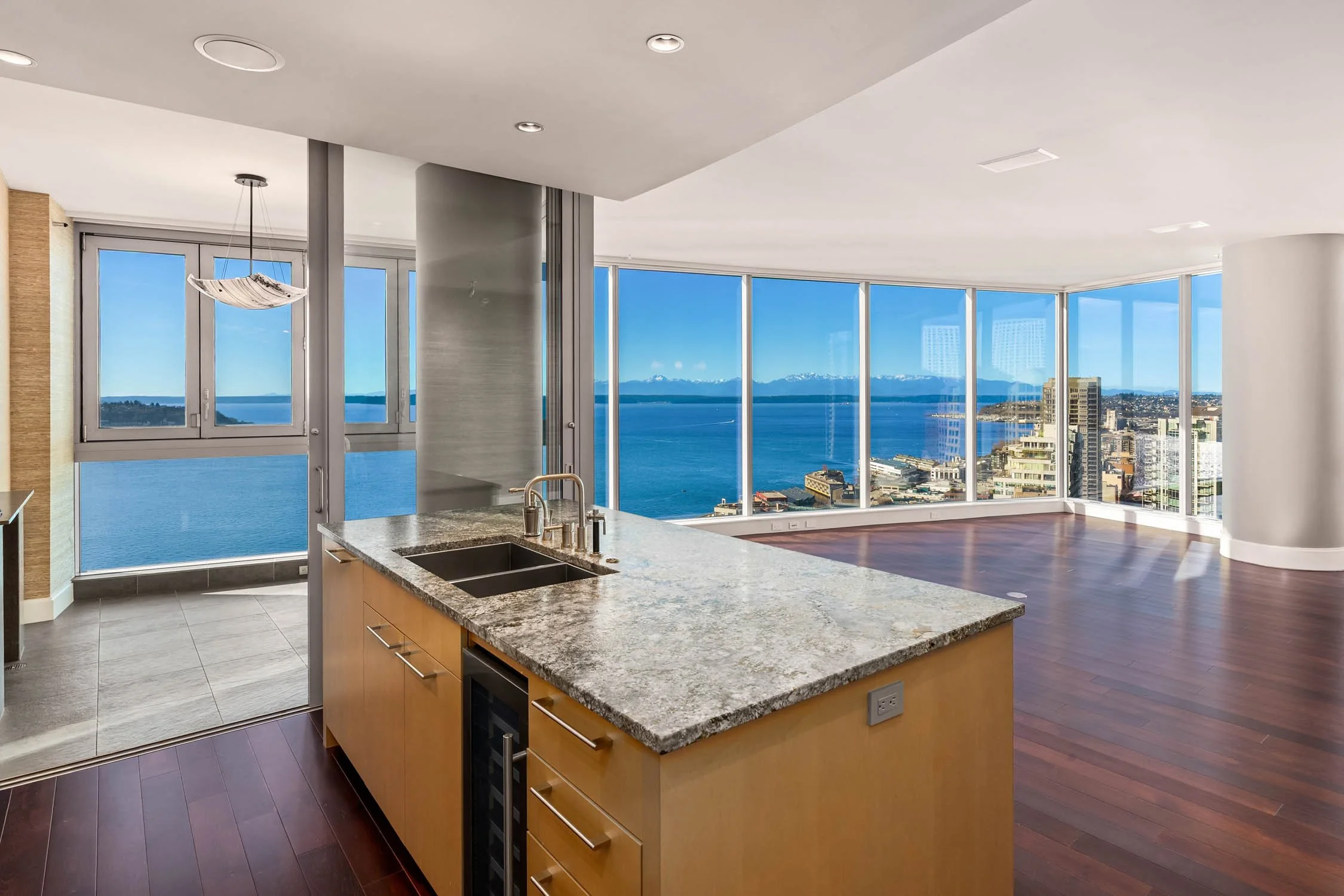 Unobstructed and best views of Seattle from this west facing home. Harbor Island Ferries, Big Wheel, Elliott Bay, Pike Place Market, New Waterfront Park, Aquarium and Olympic Mountains - Seattle's finest! This gracious open floorplan offers complete privacy and is one-of-a-kind. Situated on the 20th floor with the quintessential connection to the locals sauntering in Pike Place Market as well as the views of Elliott Bay and mountains. Your new favorite pastime will be waking up to the ferries and seagull passing by and relaxing in the evening with the sunsets over the Olympics. The primary suite and guest bedroom are facing the water and mountains. No better location when you are at the 50 yard line and front row seats! This customized condominium has thoughtful design enhancements: custom cabinetry in Office/Media room which can be closed off for potential third bedroom. Guest bedroom can double as an office with sliding doors that open the view. Two large parking stalls and generous storage. Option to purchase a wine cellar. Five star 24/hour concierge, 3 rooftops with gardens, BBQ, boardroom, fully equipped gym and yoga studio. Only steps to Seattle's new waterfront park, new Aquarium, Pike Place Market, retail, stadiums and the theater /Arts.